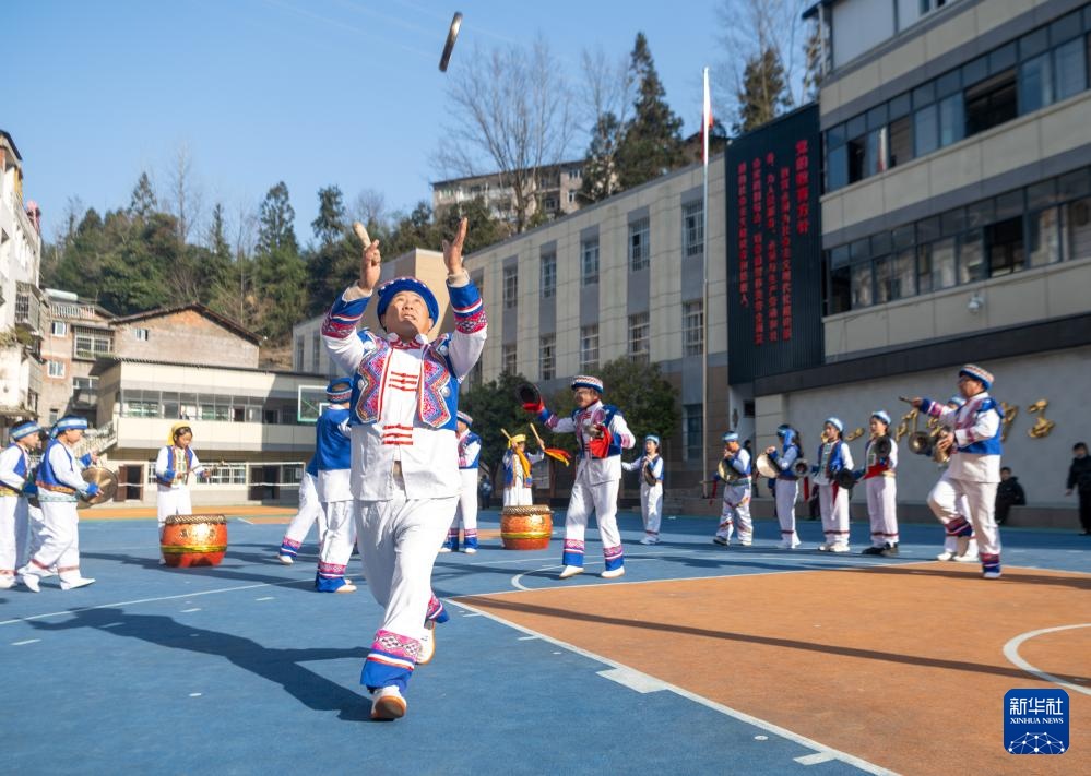 1月9日,非遗代表性传承人在石柱县沙子镇中心小学给学生演示“丢马锣”技艺。